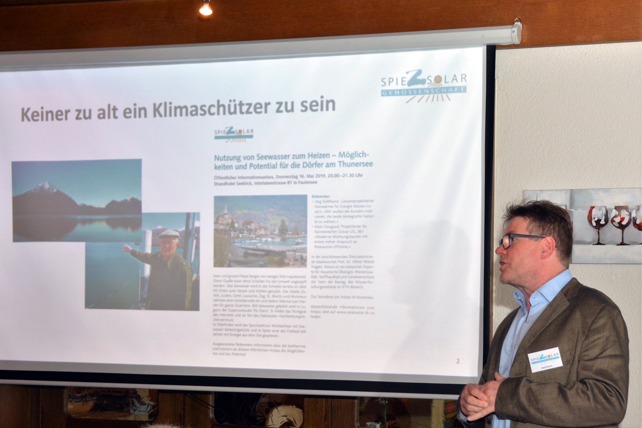 Im Anschluss an die Genossenschaftsversammlung lud die Genossenschaft zum öffentlichen Anlass zum Thema Seethermie ein. Dazu Ruedi Steuri: «Mit Seewasser zum Heizen stossen wir in ein neues Betätigungsfeld vor, mit grossem Nutzen für Gesellschaft und Umwelt».