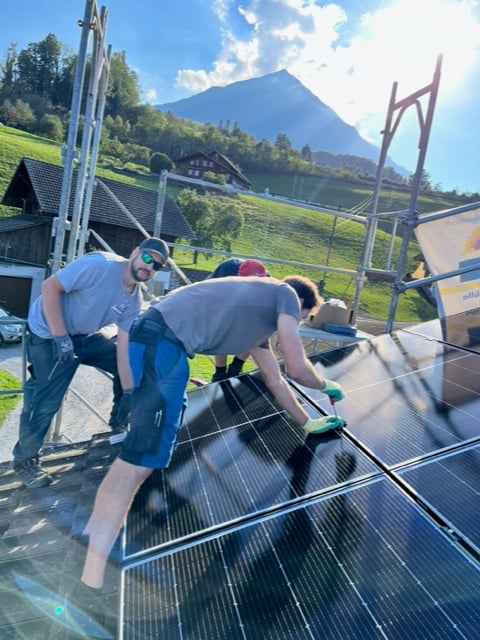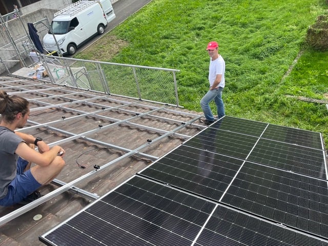 Mitglieder der Verwaltung, Genossenschafter:Innen und Freunde von SpiezSolar halfen bei der Montage der drei Solaranlagen. Die Projektleitung und die Betreuung vor Ort wurde durch Spezialisten
